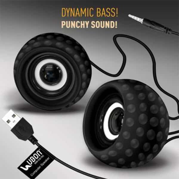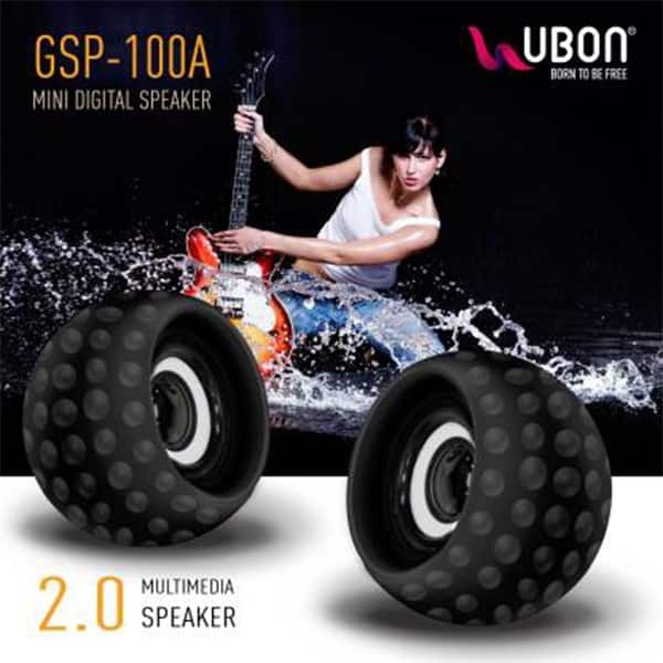 - The UBON GSP-100 are small but powerful speakers useful for anyone with a small desk space or need speakers on the go. These speakers are powered by USB. These 2.0 speakers are the ideal companion for any computer, notebook or laptop. These speakers are designed to fit small space for those with limited desk space. These speaker offers a great audio performance at an affordable price. These USB powered speakers requires a 3.5mm auxiliary input in order to connect to your PC.