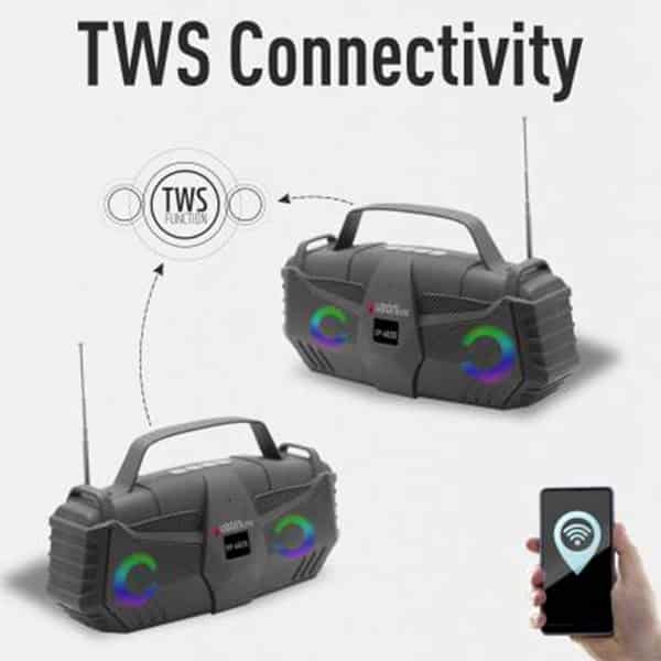 - Model Number: SP-6820 Octane Wireless speaker with LED lights 4 hours backup Built-in Mic for hands-free calling Wireless/AUX/FM/USB/TF card