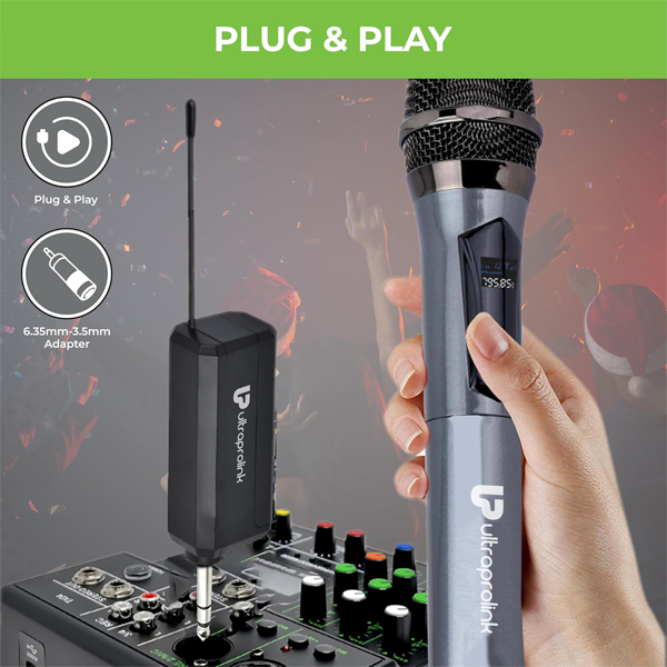 - Portable & Plug-and-Play Singing Mic System : No Bluetooth or pairing is required, simply plug the receiver into your DJ mixer, karaoke mixer, or portable speakers & turn on the mics for an instant connection.The UltraProlink Sonic Duet UM1194-2 wireless microphones are ideal for house parties, conferences, and more.