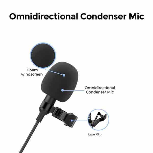- Omnidirectional Condenser Mic is sensitive to pick up sound equally from all directions so you don’t have to strain your voice. A premium Metallic Lapel Clip has been provided so it can be placed optimally & secured in place.