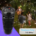 - The speaker has 10.5 hours* of playback time and comes along with a phone/ tablet holder so you can mount your phone and party away. It also has individual controls for volume, treble, bass, and tags along with remote control. Shipping