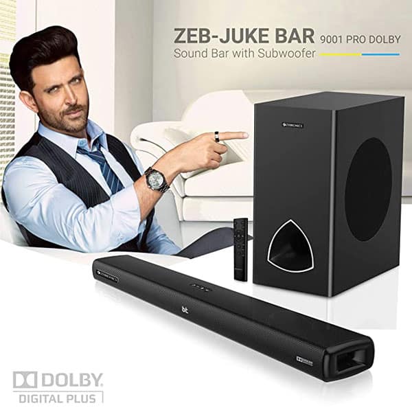 Bring home theatre quality experience with “Dolby Digital Plus” sound on ZEB-Juke Bar 9001 PRO Dolby that has a sleek design to keep things minimalistic and super compact. Movies, music or just about anything entertainment related, Zeb-Juke Bar will have you covered with its scintillating audio clarity and theatre-like sound experience right at your home with its high fidelity overall output at 120 RMS along with a 16.51cm powerful subwoofer.