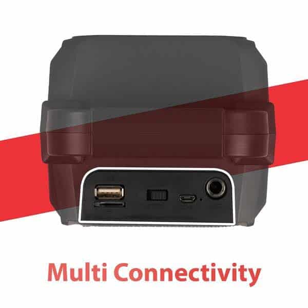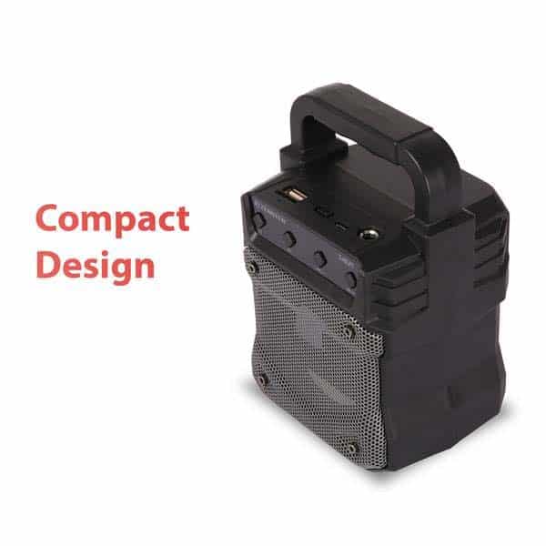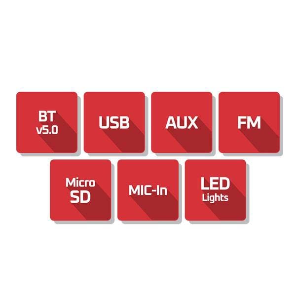 - LED light sync, Wired Mic Connectivity, Built-in FM, Media/Volume control, Aux Input, Supports USB and mSD, In-built Rechargeable battery, Wireless BT.