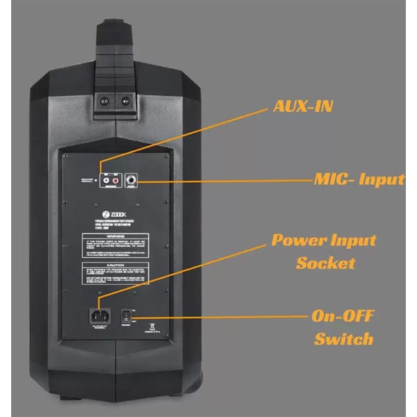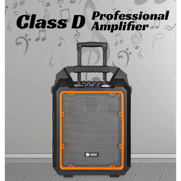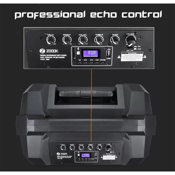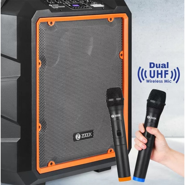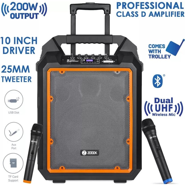 - Dual UHF Wireless Mic, EQ control, bass control, treble control, echo control, trolley