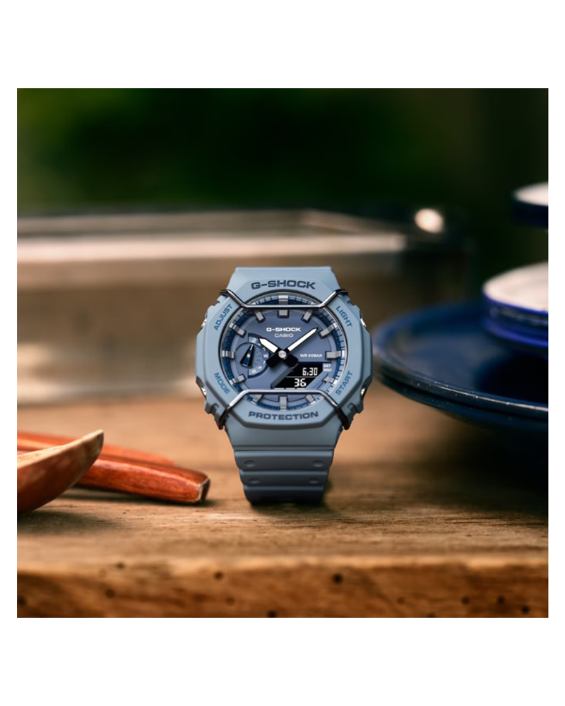 Casio G-Shock 2100 Series Carbon Core Guard Structure Round Resin Analog+Digital World Time Stop Watch Alarm LED Light Calender Timer Blue Grey Resin Band Watch