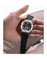 Guess Mens Headline Silver Stainless Steel Case Gunmetal Dial Day+Date Black Leather Strap Watch