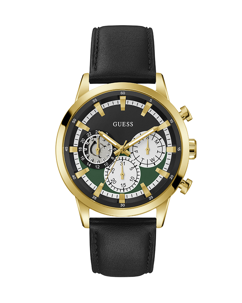 Guess Mens Insider Gold-Tone Stainless Steel Case Black/Green Dial Day+Date Black Smooth Leather Strap Watch