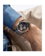 This new oversized dress style features a coin edge bezel and chrono-look multi-function dial on a sleek 3-link bracelet