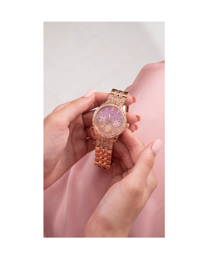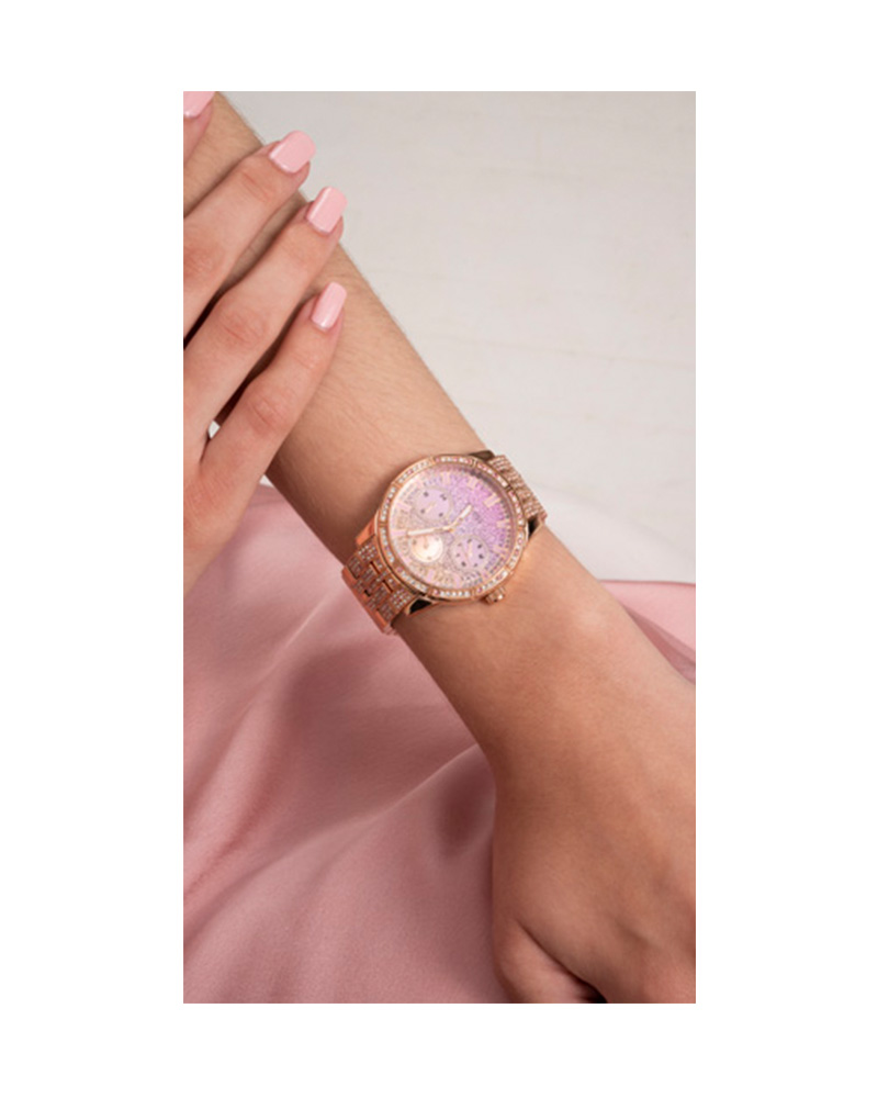 Guess Womens Rosegold Tone Stainless Steel Case Pink Dial Quartz Sunray Analog Multi-Function Rosegold Metal Bracelet Watch