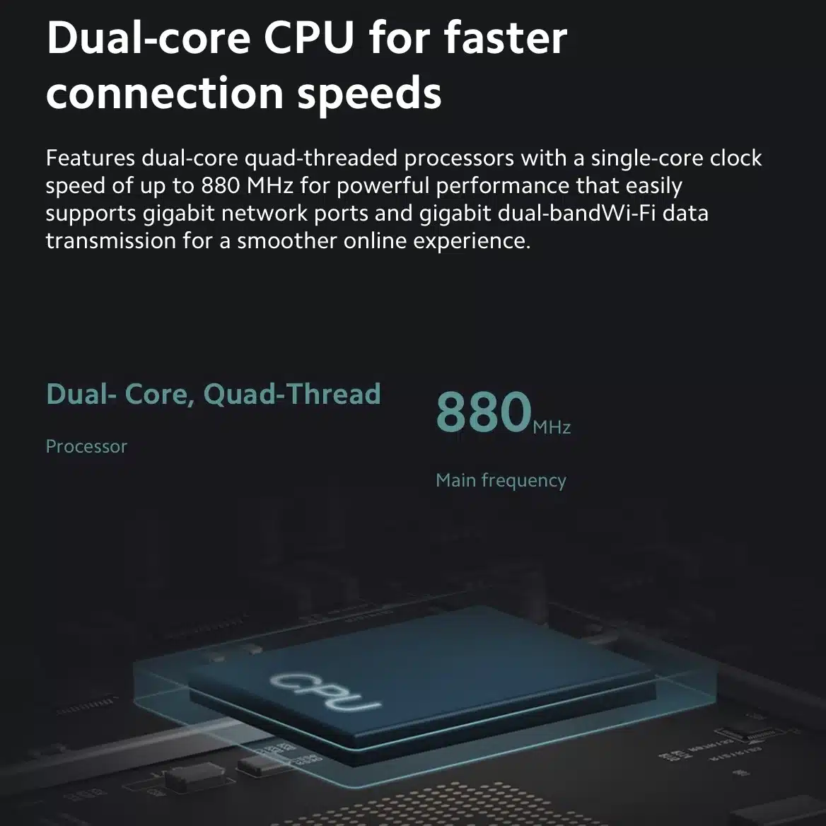 Powered by a dual-core CPU with four-thread processing and a single-core frequency up to 880MHz, this router delivers smooth gigabit network access and handles multiple devices without lag. With 128MB of memory, it ensures stable connectivity even in a smart home environment where many devices are connected simultaneously.