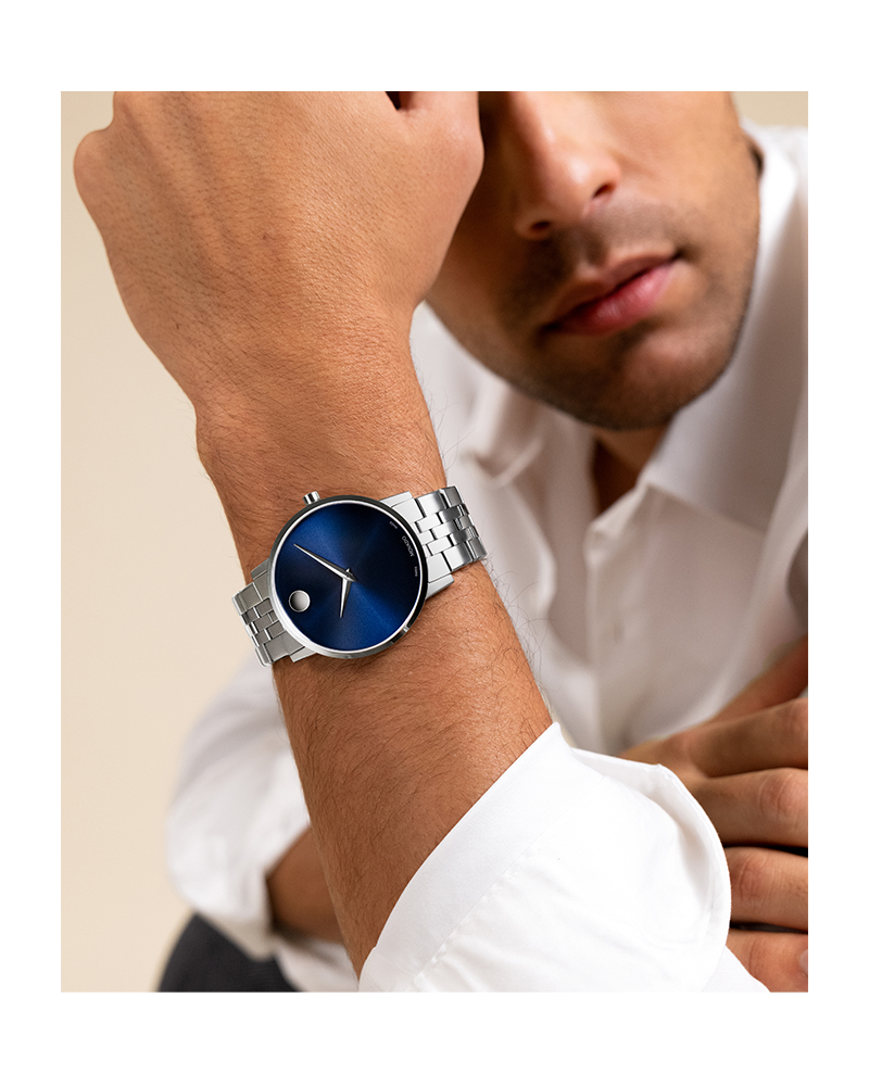 It’s time you owned a masterpiece The Movado Museum Classic is an icon of modern design, featured in museums worldwide and renown for the elegant simplicity of the dial—defined by a single dot at 12 o’clock, a design element that symbolizes the sun at high noon. In this style, we’ve paired a 40mm stainless steel case with a luno blue sunray dial—outfitted with our signature dot and slender hands—with a timeless stainless steel bracelet.