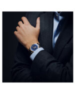 The bezel is decorated with a vertical satin-brush that contrasts wonderfully with the highly polished bevel nearby. This juxtaposition of two finishes reinforces the overall level of finishing. A sapphire caseback affords sight of the self-winding movement within and the “W-shaped” oscillating weight, RAYMOND WEIL’s horological signature. The navy blue genuine calf leather strap is enhanced with a unique W-stitched detail.