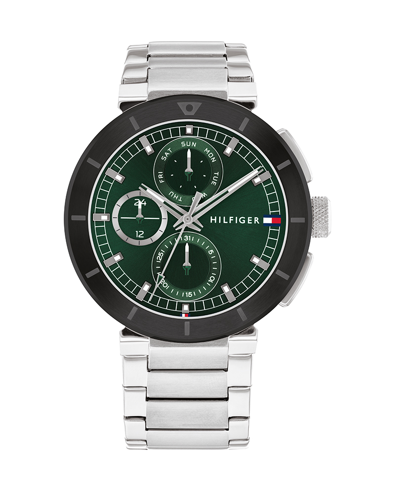 Tommy Hilfiger Mens Silver Stainless Steel Quartz Calendar Green Dial Silver Stainless Steel Bracelet Watch