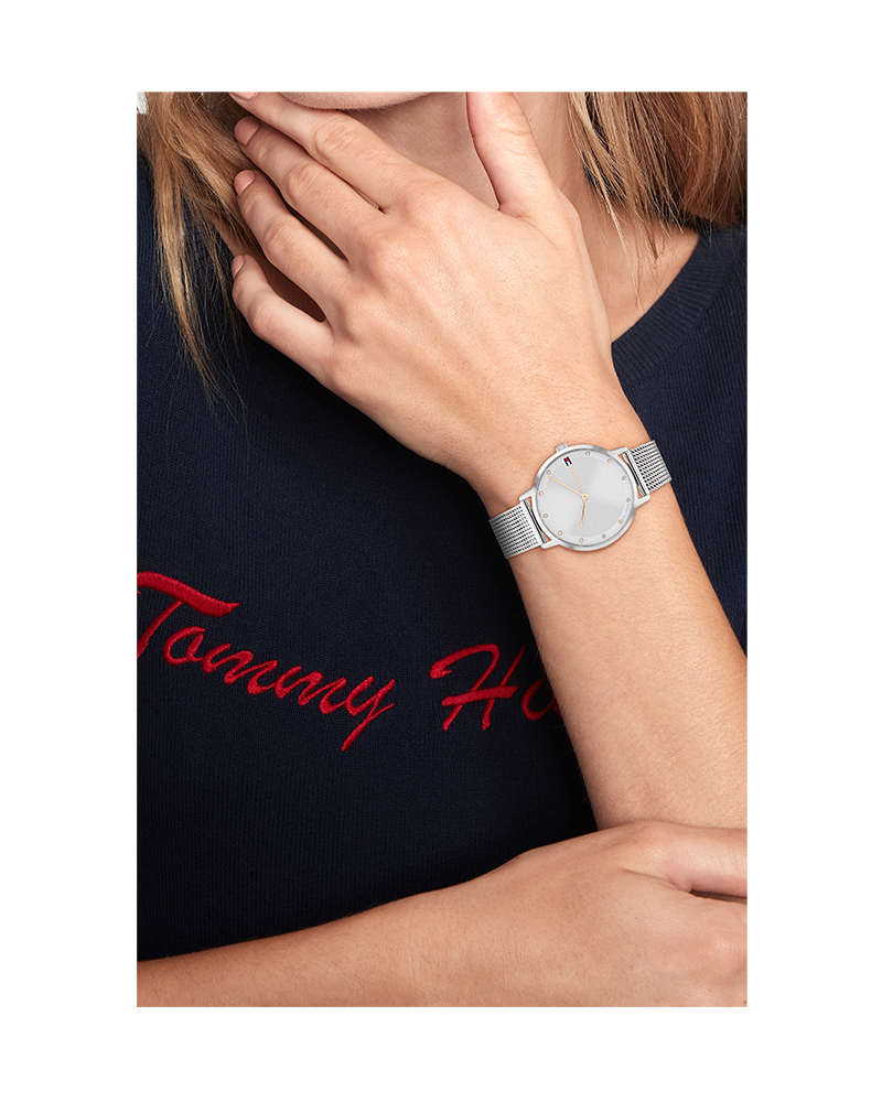 Tommy Hilfiger Womens Silver Stainless Steel Quartz Silver Dial Crystals Silver Mesh Stainless Steel Bracelet Watch