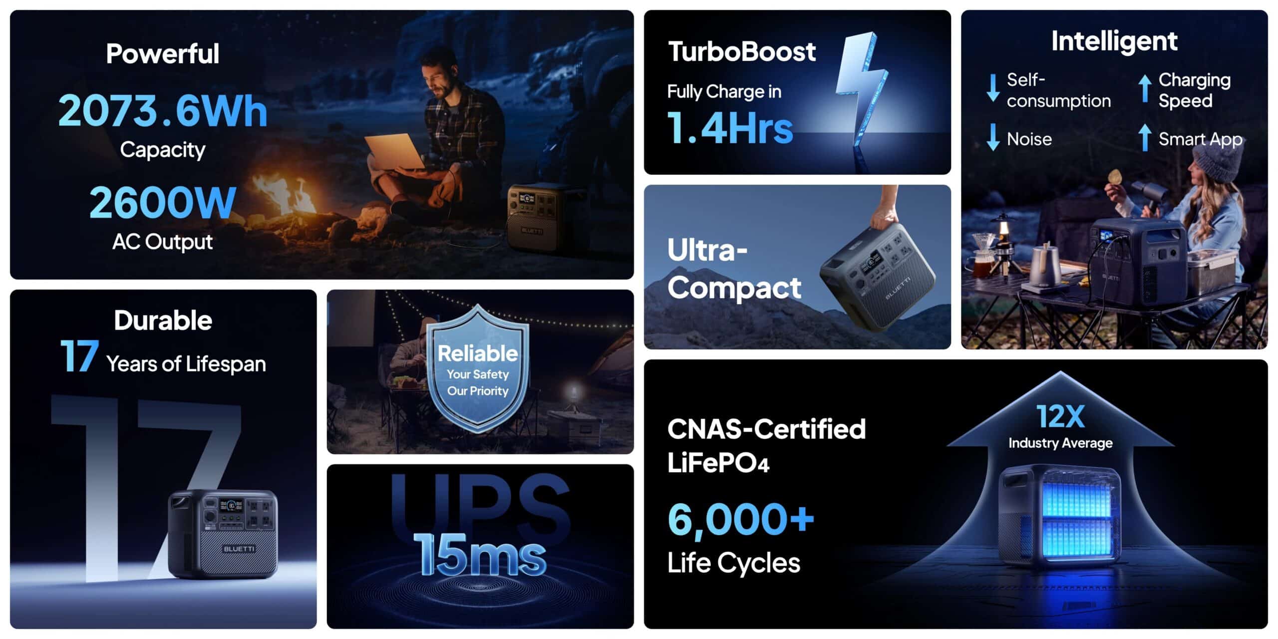 Wherever you are, experience lightning-fast charging that keeps your devices running without delay. The TurboBoost technology allows you to reach 80% charge in just 1 hour. While exploring the outdoors, you can access solar energy and get a full charge in about 2.4 hours. Even driving on the road, you can charge it efficiently via our latest innovation – BLUETTI Charger 1, which is 6X faster than conventional car chargers.