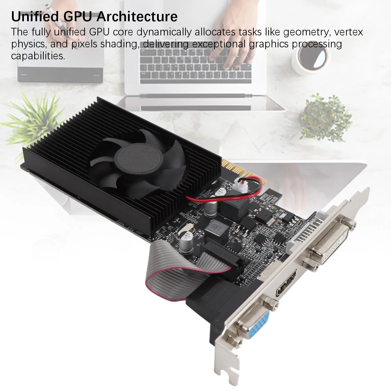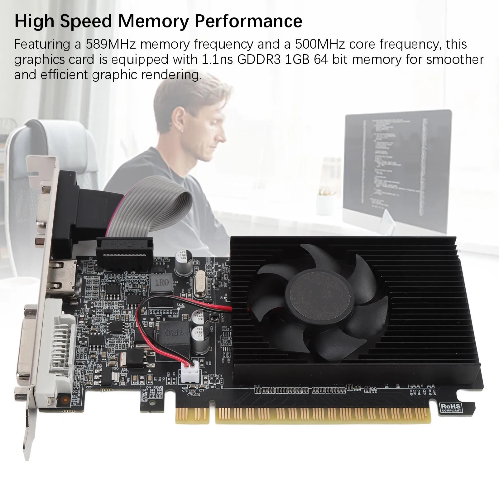 Experience reliable graphics performance with this 1GB DDR3 graphics card featuring a 64-bit memory interface and core clock speed of 500MHz. The 589MHz memory frequency ensures smooth rendering, powered by fast 1.1ns GDDR3 memory.