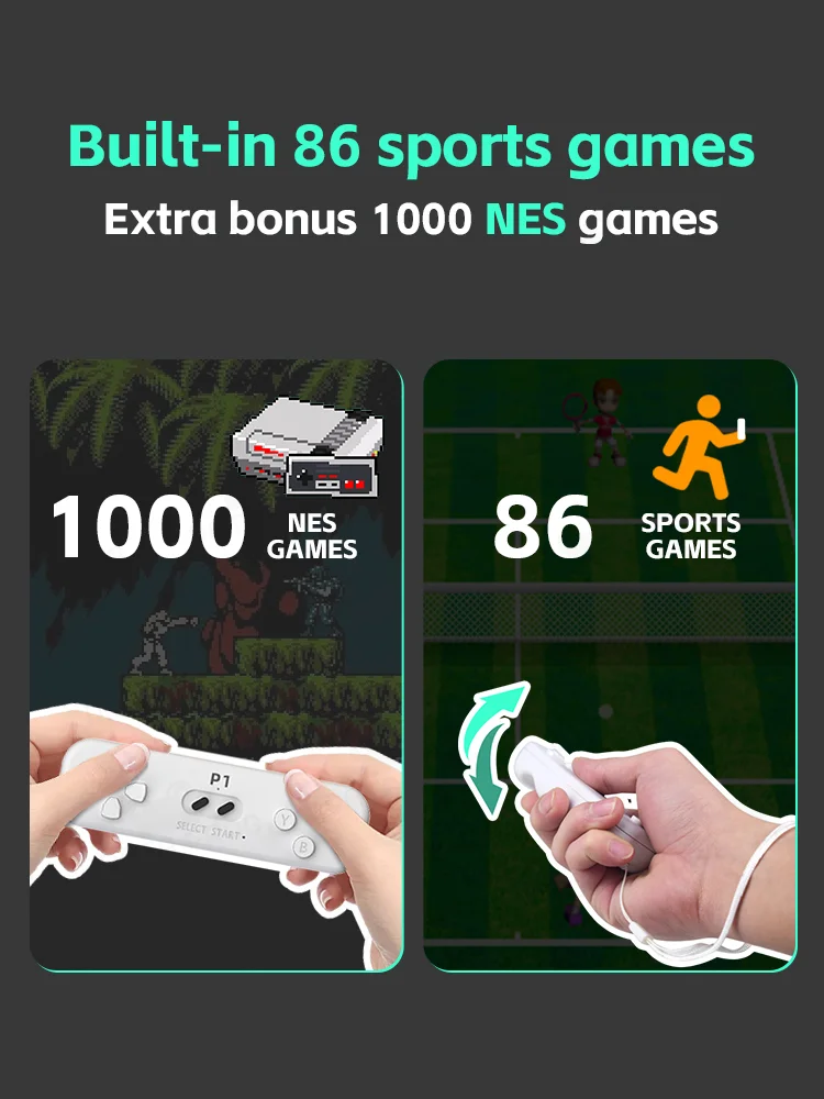 Experience gaming like never before with this retro game console featuring interactive motion sensing technology! 🎮✨ Wave the wireless gamepad to control your in-game movements, making gameplay both fun and a light workout to help prevent spine issues from prolonged sitting.