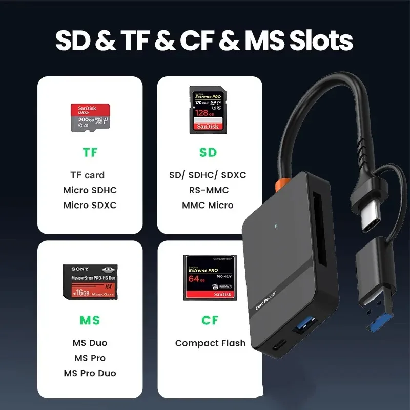 8-in-1 USB 3.0 card reader supporting SD, Micro SD, CF, MS, and more. Fast data transfer with hot plug & play, compatible with Windows, Mac, and Android devices.
