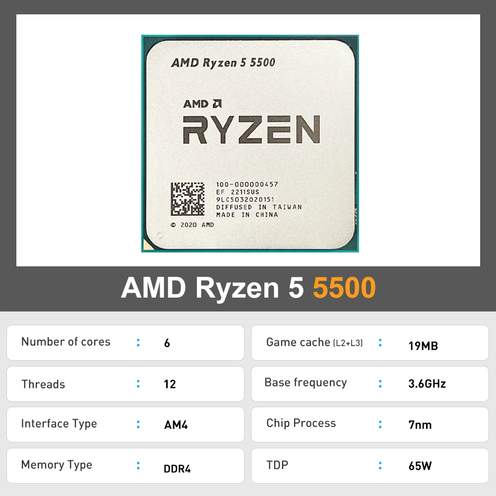 AMD Ryzen 5 5500 CPU with 6 cores and 12 threads, 3.6GHz base and 4.2GHz boost clocks. Supports AM4 socket, DDR4 memory, PCIe 3.0, and features 16MB L3 cache. No cooler included.