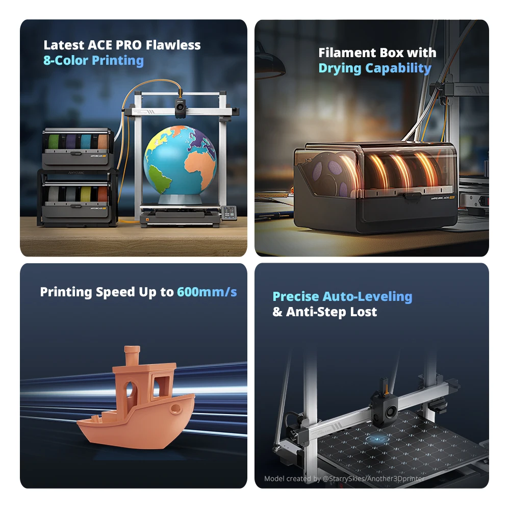 - Filament Management: ACE PRO units offer intelligent drying, auto refill, and tangle detection for uninterrupted printing.