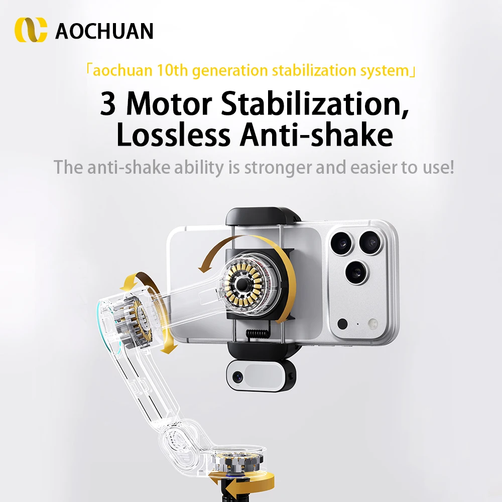 Experience smooth and stable footage with the AOCHUAN Smart X3 3-Axis Gimbal Stabilizer designed for smartphones 55-85mm wide. Featuring a 3-motor stabilization system, it minimizes shake across 337° panning, 345° rolling, and 345° tilting angles for professional video quality.