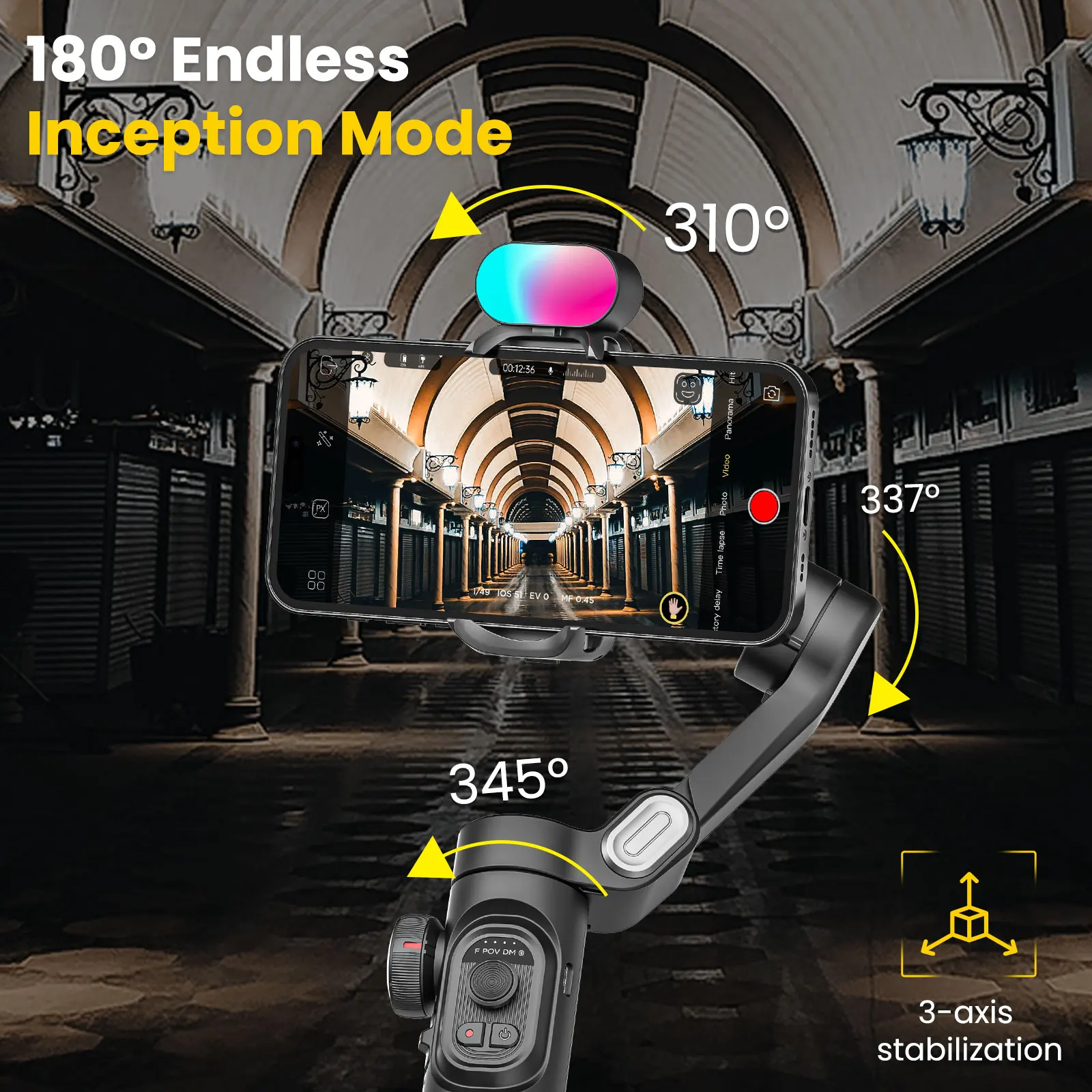 Lightweight 3-axis gimbal stabilizer for smartphones up to 90mm. Features Bluetooth control, vertical shooting, face recognition, and an extension rod for versatile filming.