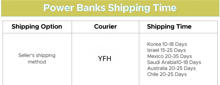 Tip: Regarding the transportation time of mobile power banks, please ignore the default delivery ime displayed by the system and refer to the following reference time. If you are unsure, please ask customer service.