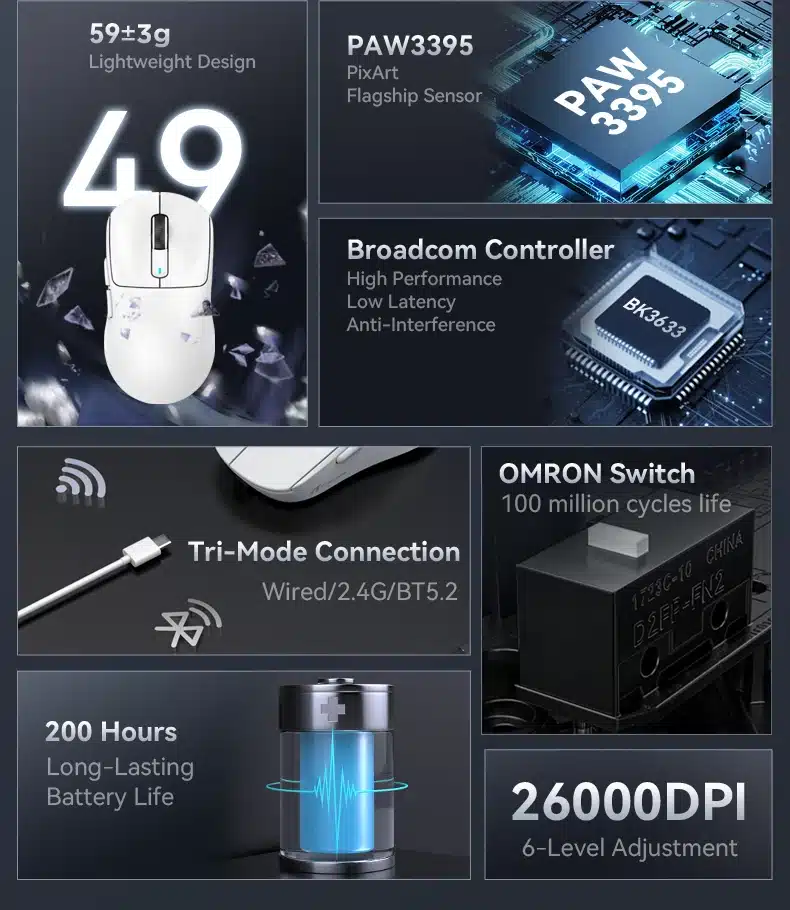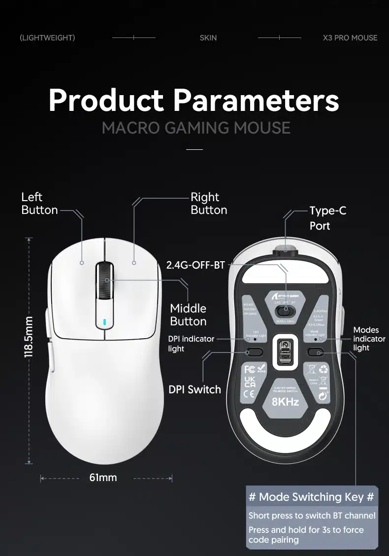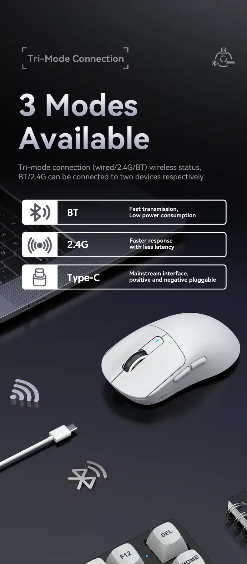 Tri-Mode Connection:Tri-mode connection(wired/2.4G/BT) wireless status,BT/2.4G can be connected to two devices respectively