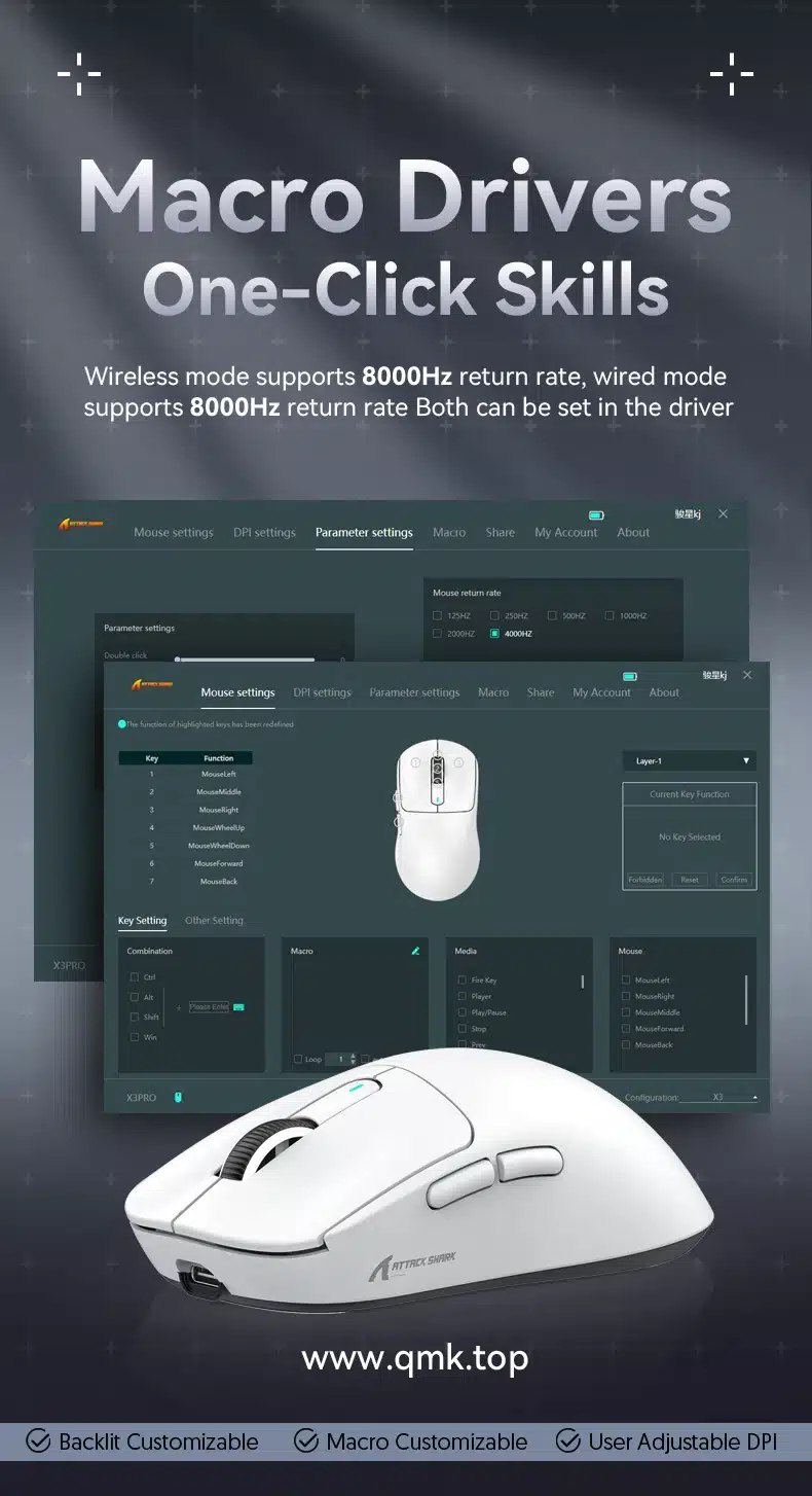 Macro Drivers:One app for total control. dpi adjustments, payback rates,custom macros,A range of configurations such as keystrokes and programming can be set and saved in the driver.