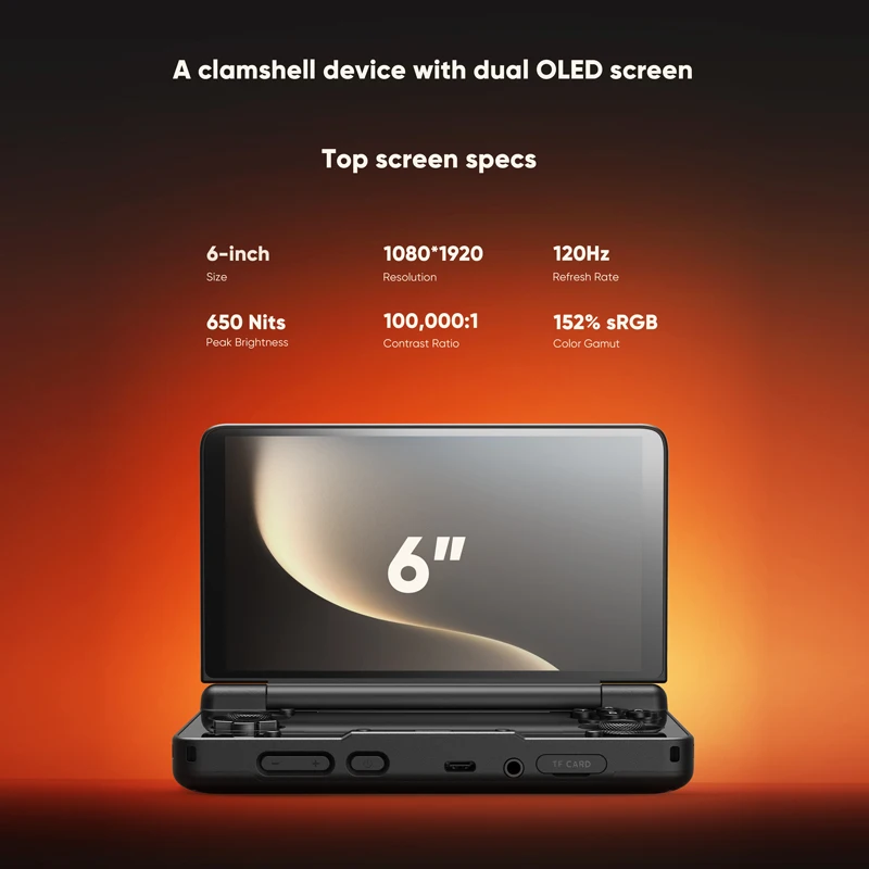 Powerful AYN Thor handheld with 6″ AMOLED dual screens, 1080p resolution, RGB joysticks, 6000mAh battery, Android OS, and multiple storage options up to 1TB.