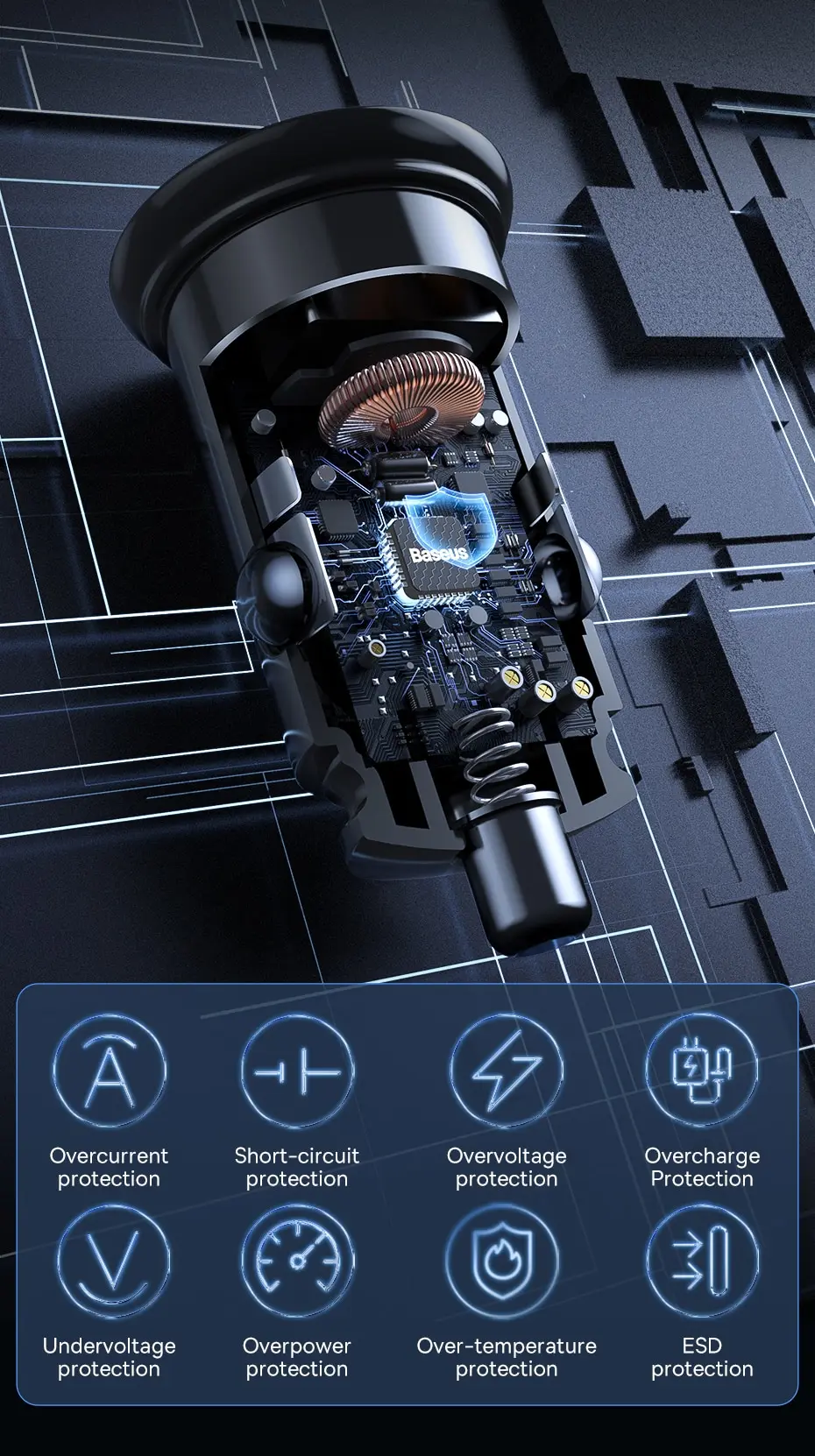 Built-in smart chip automatically adjusts power output and provides multiple protections: