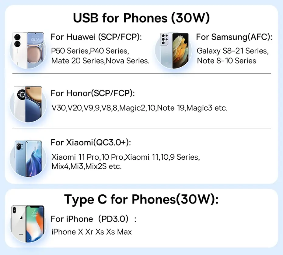 Works smoothly with many popular smartphones including models from Huawei, Xiaomi, Samsung, Honor, and iPhone, ensuring stable and efficient charging.