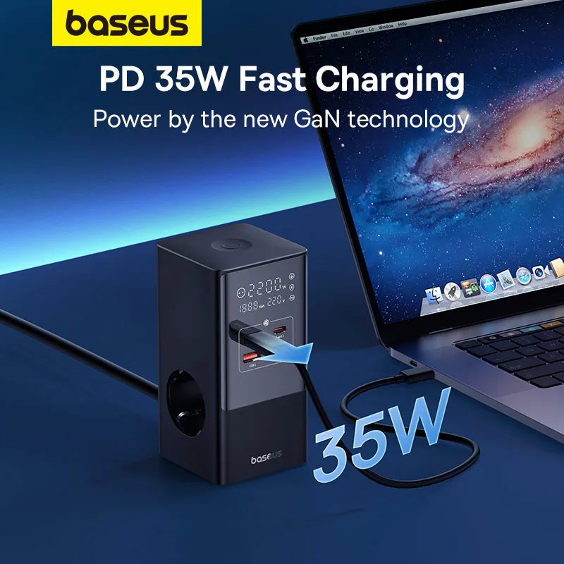 Experience efficient and safe charging with the Baseus PowerCombo Tower, a 7-in-1 fast charging station combining a power strip and charger in one sleek design. Equipped with 3 AC outlets, 2 USB-A ports, and 2 USB-C ports, it supports a maximum output power of 35W with advanced GaN technology for fast and reliable charging.