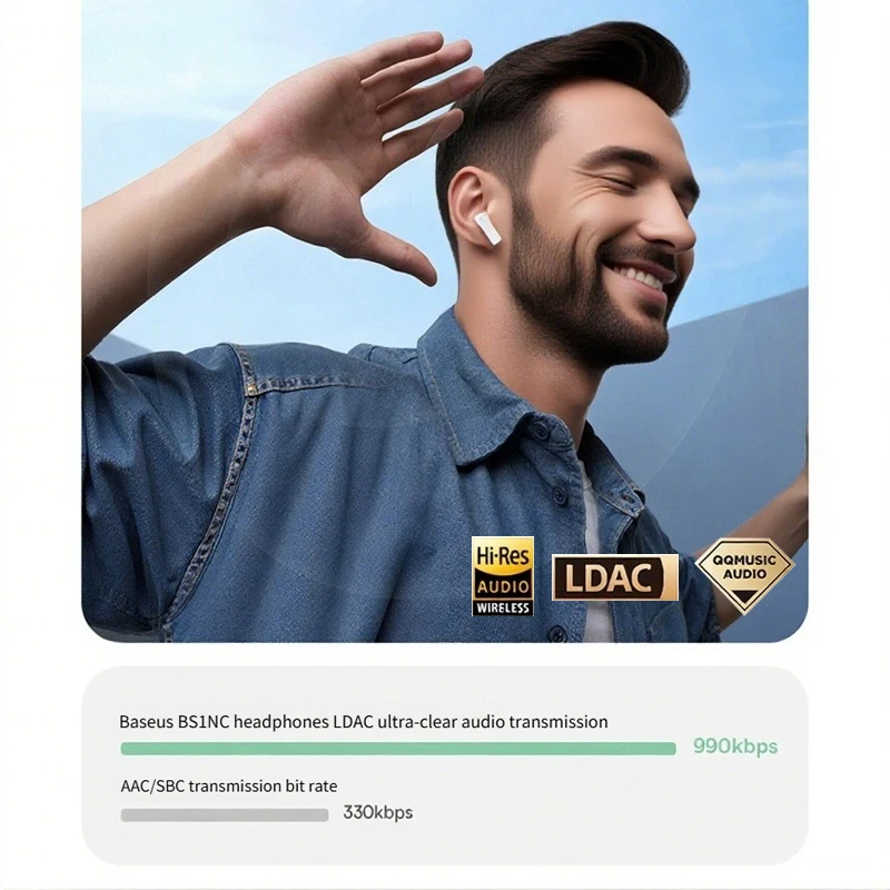 Baseus BS1 NC wireless earbuds feature Bluetooth 6.0, active noise cancellation, IP55 waterproof rating, and a 40-hour battery life with charging case. Supports AAC, SBC, LDAC codecs and AI call noise reduction for clear calls.