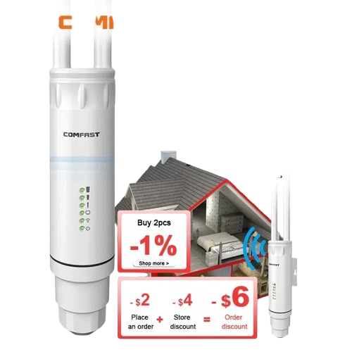 The Comfast CF-EW74 is a high-performance outdoor Wi-Fi Access Point/Repeater that provides a wide coverage for areas such as factories, communities, and streets. It extends existing wireless signals (2.4GHz or 5GHz) to reach areas that are otherwise out of range of a regular router or access point. This model supports dual-band Wi-Fi with a maximum speed of 1200Mbps and is designed for outdoor usage with a robust, weatherproof case (IP66 rating).