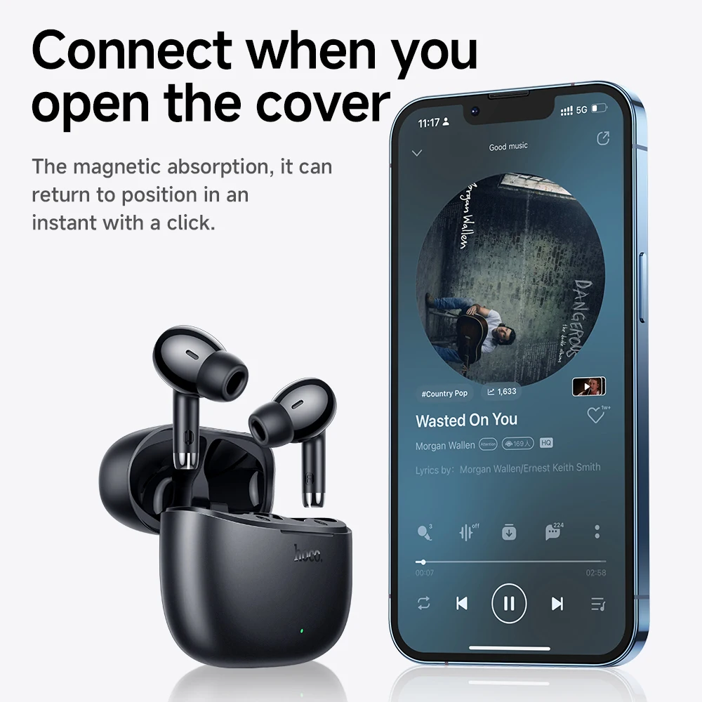HOCO EQ2 Wireless Earbuds feature Bluetooth 5.3, dynamic 13mm drivers, touch control, and waterproof design. Enjoy up to 7 hours playback with a 320mAh charging case. Includes USB Type-C charging cable.