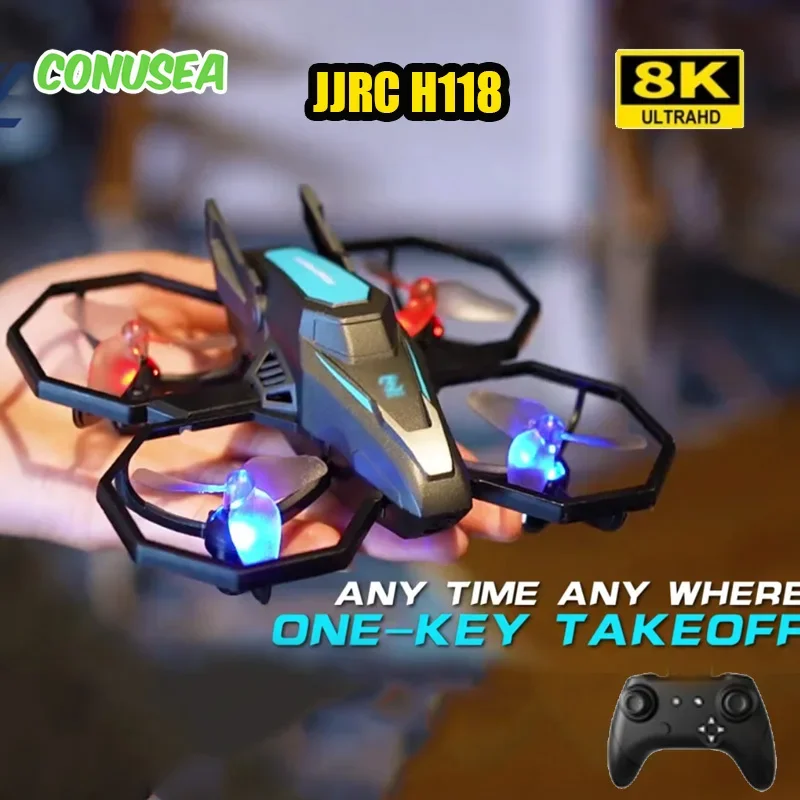 JJRC H118 drone with 8K camera, WiFi FPV, 7-min flight, 70m range, altitude hold, 3D flips, and protective guards. Includes remote and spare blades.
