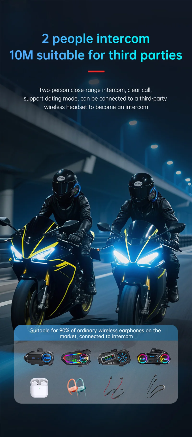 Stay connected on the road with the two-person intercom system, allowing riders to communicate up to 10 meters apart without needing to connect to a phone. Perfect for riding partners, group rides, or quick coordination while traveling.