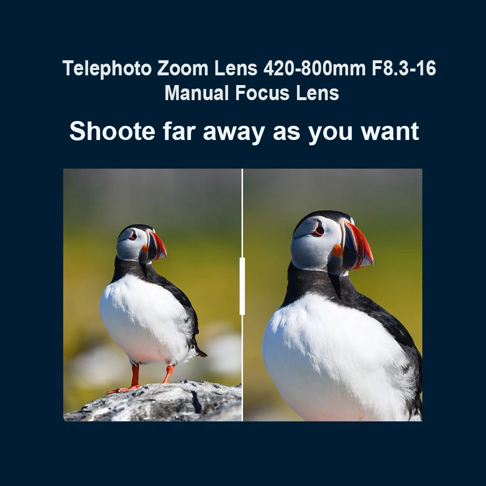 Manual zoom telephoto lens with 420-800mm focal length, F8.3-F16 aperture range, multi-coated optics for sharp images, and compatibility with Nikon, Canon, Sony, Fuji, and Olympus cameras.
