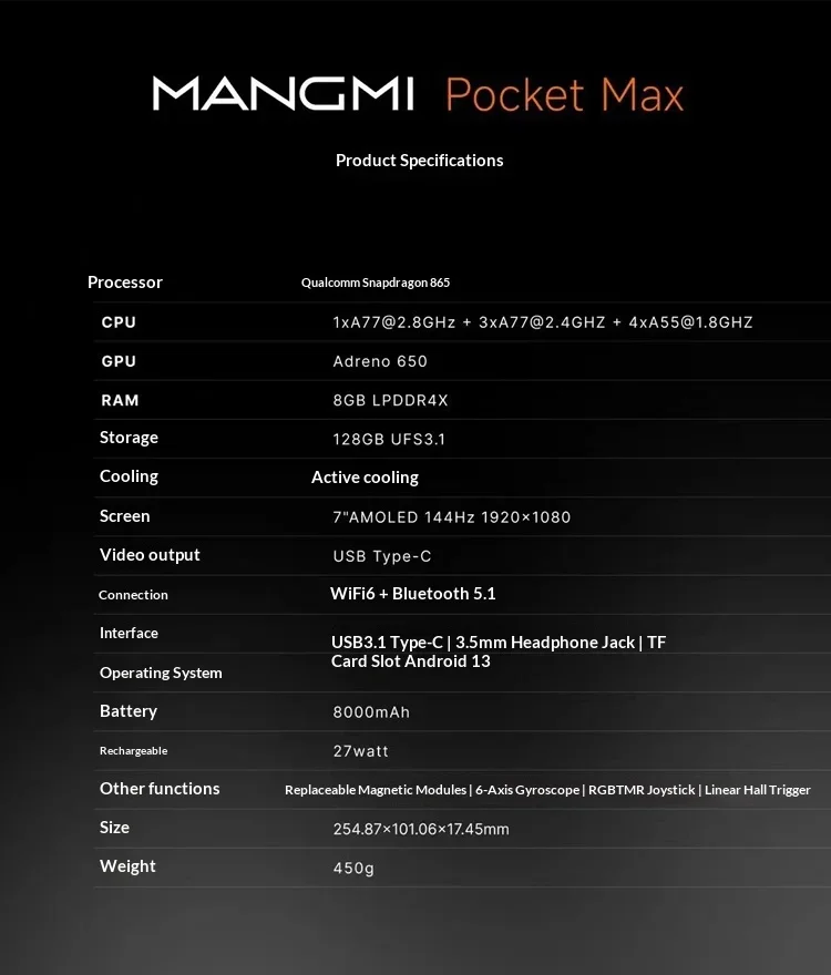 Experience top-tier handheld gaming with the MANGMI Pocket Max! Featuring a vibrant 7.0″ OLED display with a smooth 144Hz refresh rate and Full HD 1920×1080 resolution, dive into your favorite games with stunning clarity. Powered by a Snapdragon 865 processor paired with 8GB RAM and 128GB ROM, it ensures seamless performance and ample storage for your games and apps.