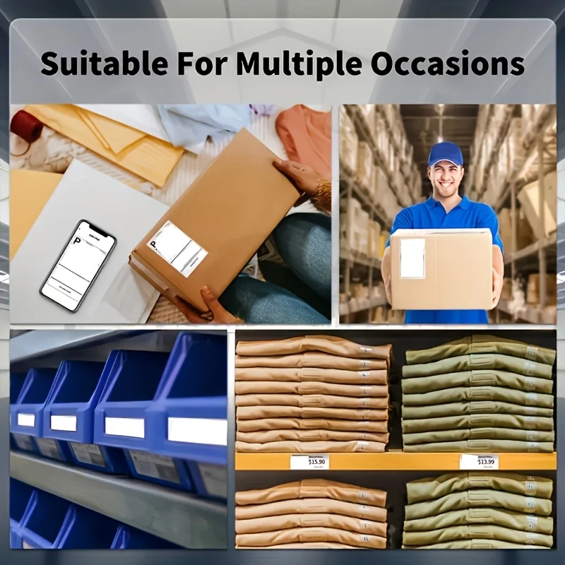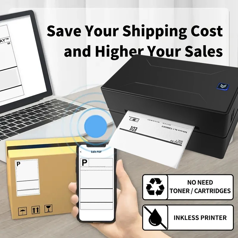 Inkless thermal printer with 203 dpi resolution and 12ppm speed. Bluetooth 4.0 wireless connection for Mac, iOS, Windows, and Android. Supports up to 110mm wide labels with durable print head lasting 50 km. Ideal for home, office, and small business use.