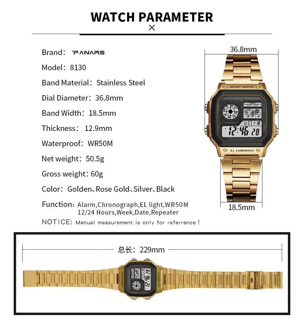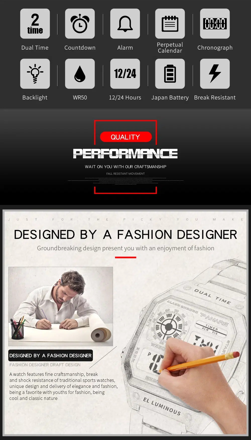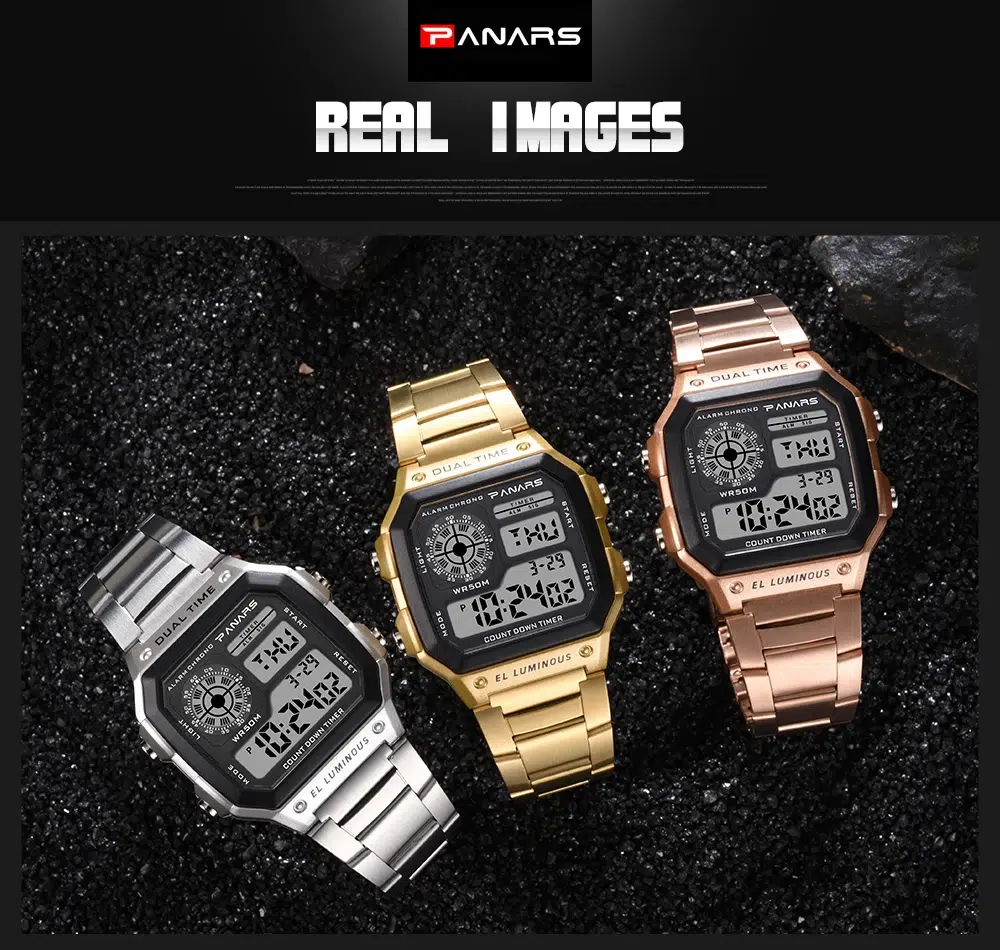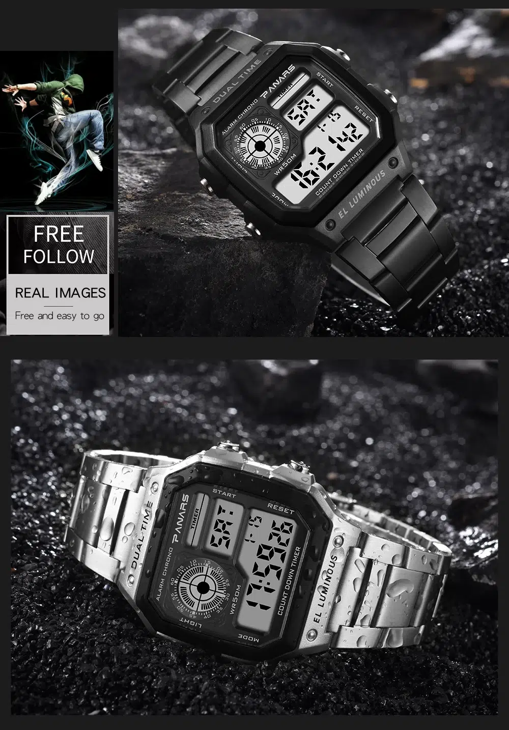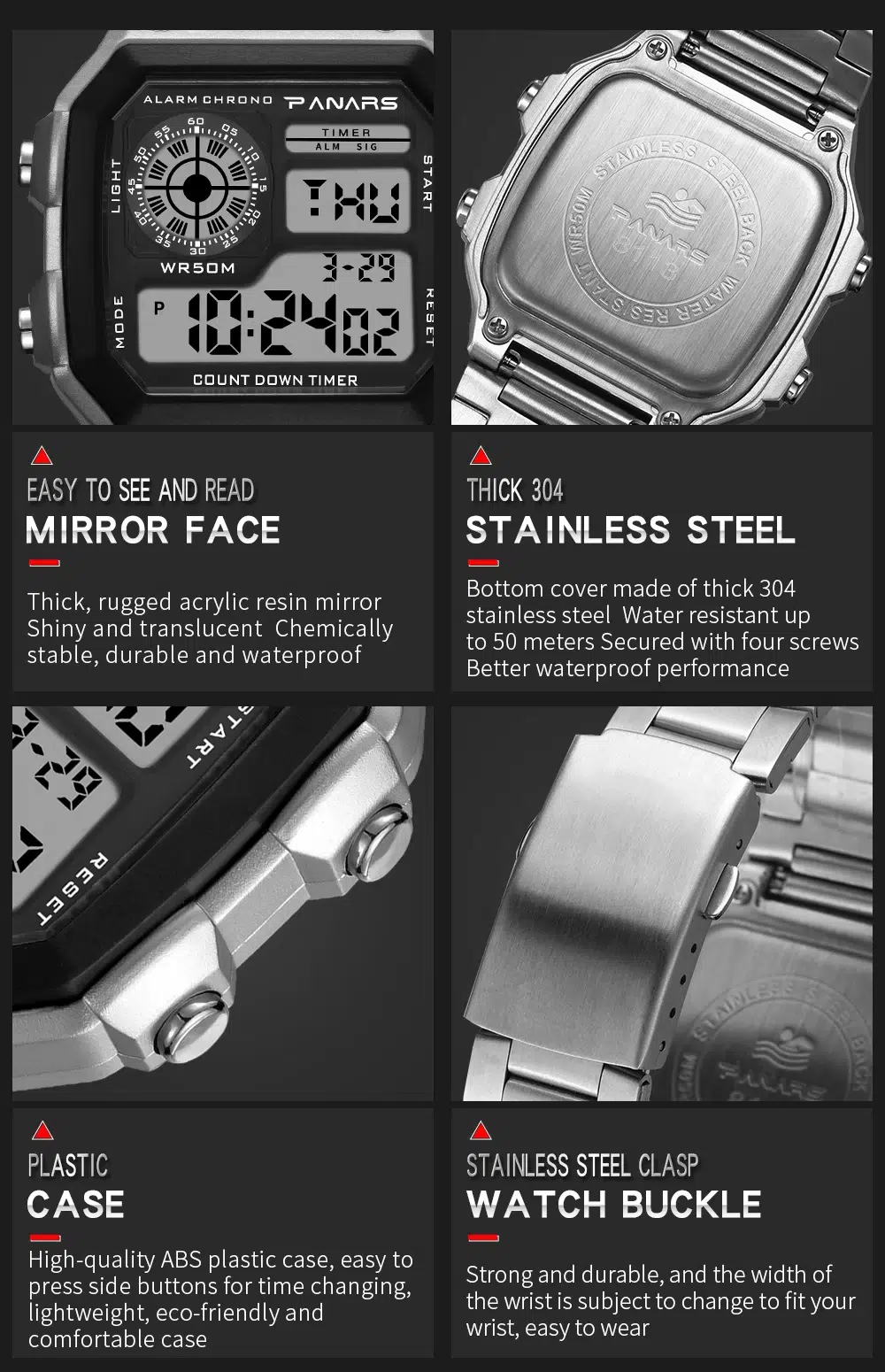 ✔ Premium Build Quality – Crafted with high-quality ABS plastic case, stainless steel strap, buckle, and bottom cover, plus a hardened acrylic resin mirror for added toughness.