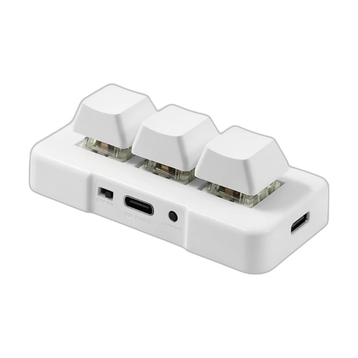 Compact 3-key mini keyboard with mechanical blue switches and USB+Bluetooth dual mode. Customizable keys for multimedia, gaming, and macro functions. Ergonomic design with anti-slip base. Includes rechargeable 140mAh battery.