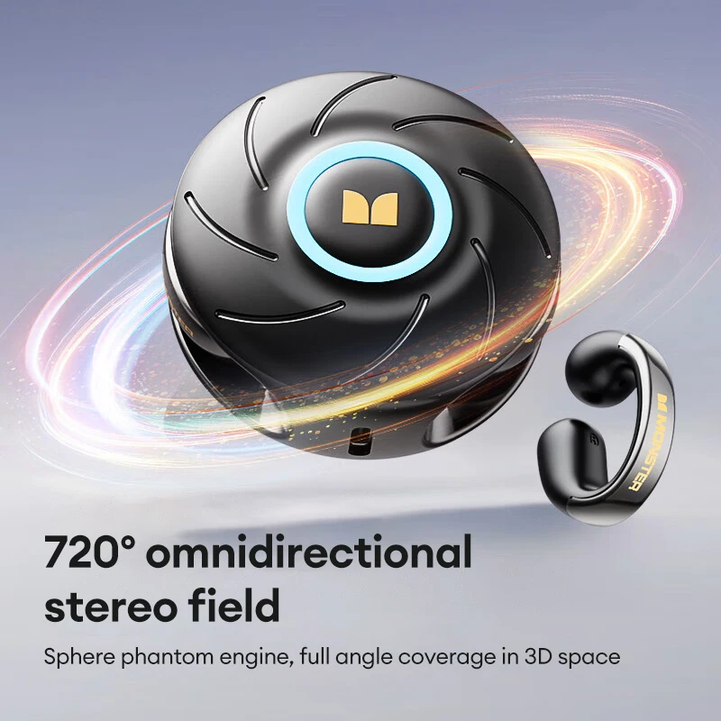 Monster MQT46 wireless earbuds with Bluetooth 5.4 deliver rich 3D sound and active noise cancelling. IPX4 waterproof design and 25 hours battery life with fast Type-C charging. Built-in mic and comfortable ear-clip fit for sports and gaming.