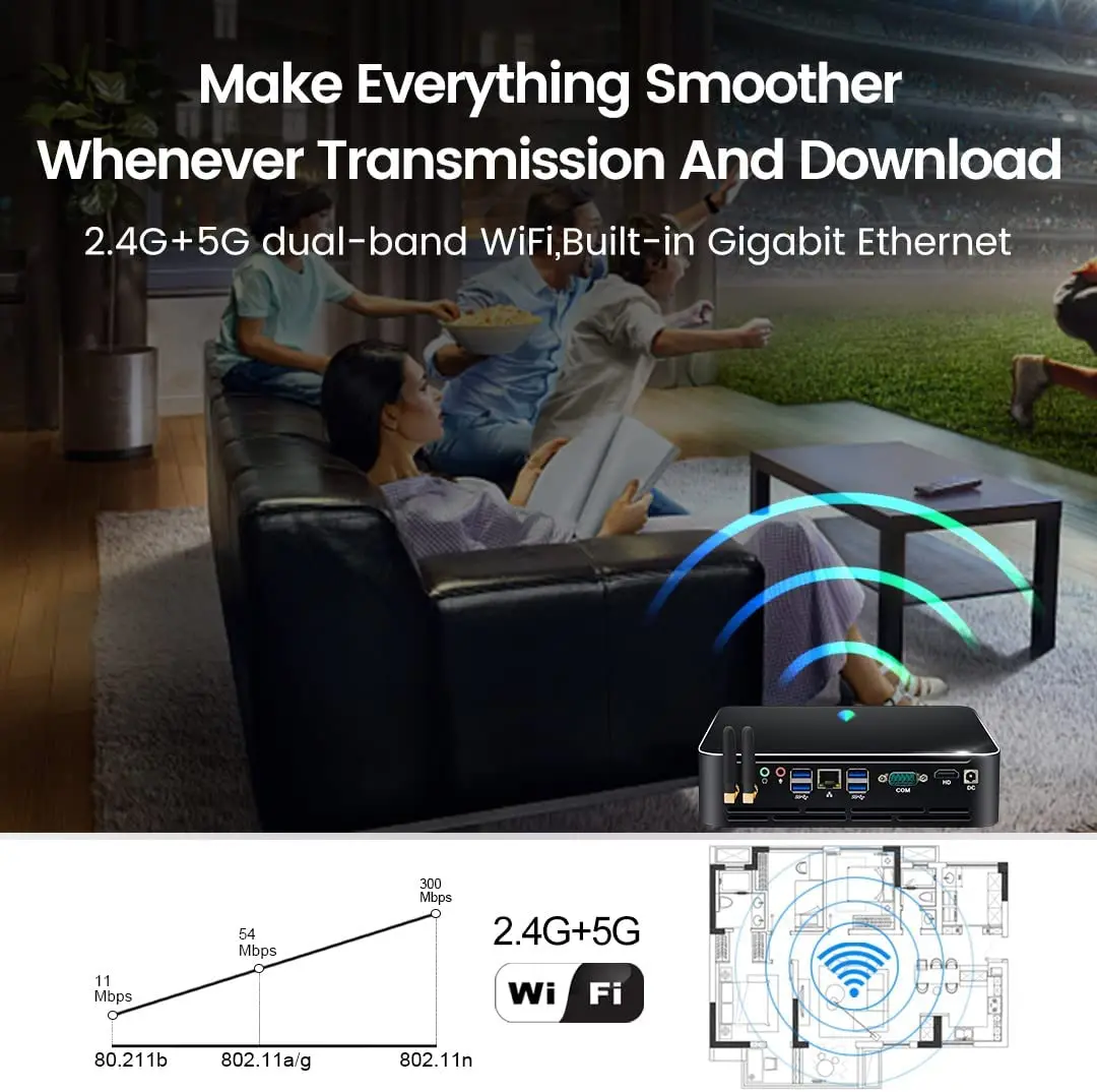 • Connectivity: Equipped with dual-band WiFi (802.11 A/B/G/AC), Bluetooth, RJ45 Gigabit LAN, 2 USB 3.0, and 6 USB 2.0 ports for versatile peripheral support.