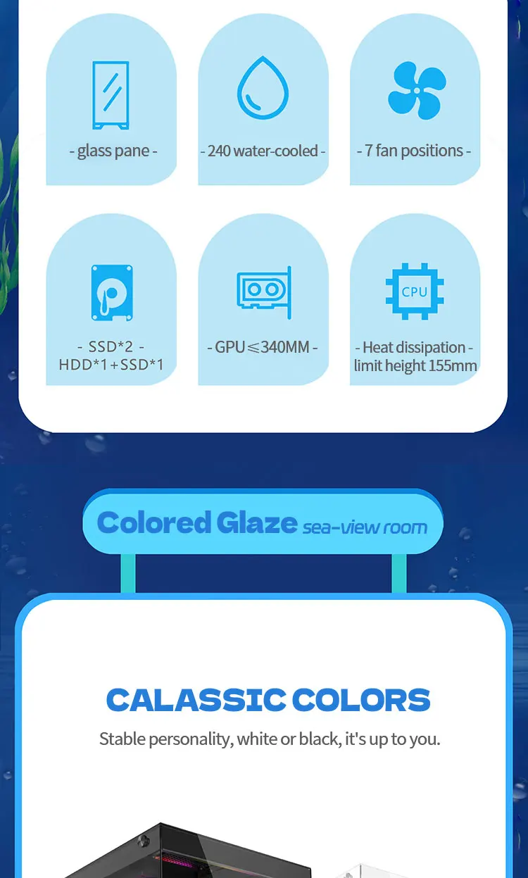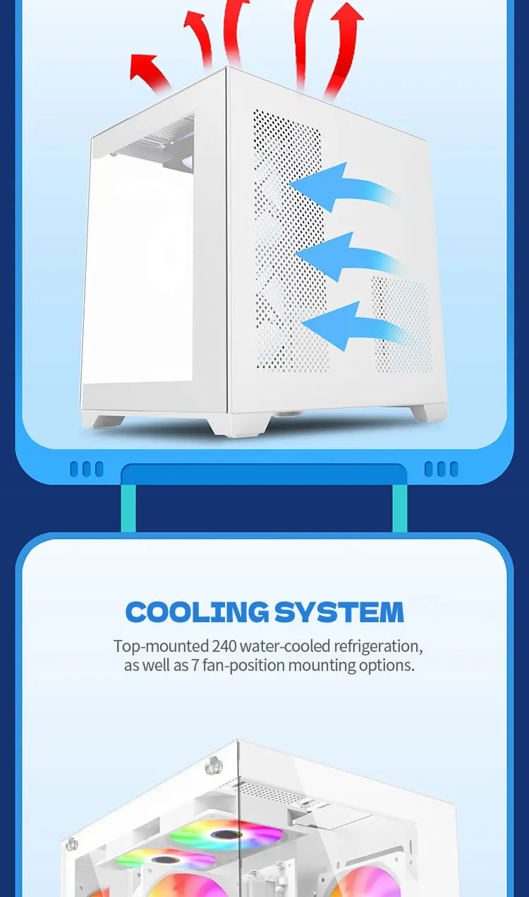 Cooling performance is well optimized with support for up to 7 × 120mm fans, providing strong airflow potential for stable system temperatures. It also supports 240mm liquid cooling radiators, allowing users to build efficient water-cooled systems for high performance computing.