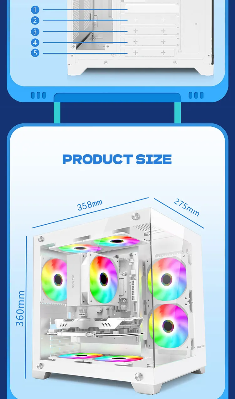 Premium Power Train Coloured Glaze horizontal desktop chassis with tempered glass panel, iron build durability, Micro-ATX/ITX support, 340mm GPU clearance, 7 fan airflow support, 240mm radiator cooling, and compact 358×275×360mm design for modern PC builds.