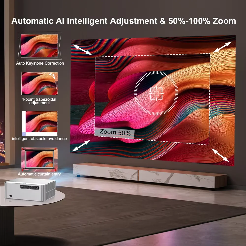 In addition to adopting improved Auto Focus AI and Auto keystone algorithms, this projector also introduces obstacle avoidance and automatic screen adjustment. The built-in high-precision sensor ensures that the image automatically adapts to the edge of the screen and avoids obstacles. No manual adjustment is required for clear images in seconds. Zoom from 50% to 100% allows you to adjust the image size without moving the projector.