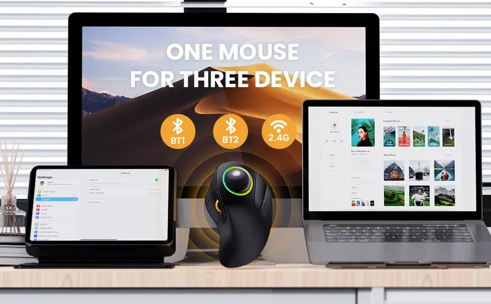 BLUETOOTH & 2.4G WIRELESS CONNECTION:PLUG and PLAY. This trackball mouse has triple connection modes. You can control three devices at the same time, switch freely between Android, tablet and Mac with just one button. Compatible with Windows, Android, Mac OS PC Laptop Desktop etc