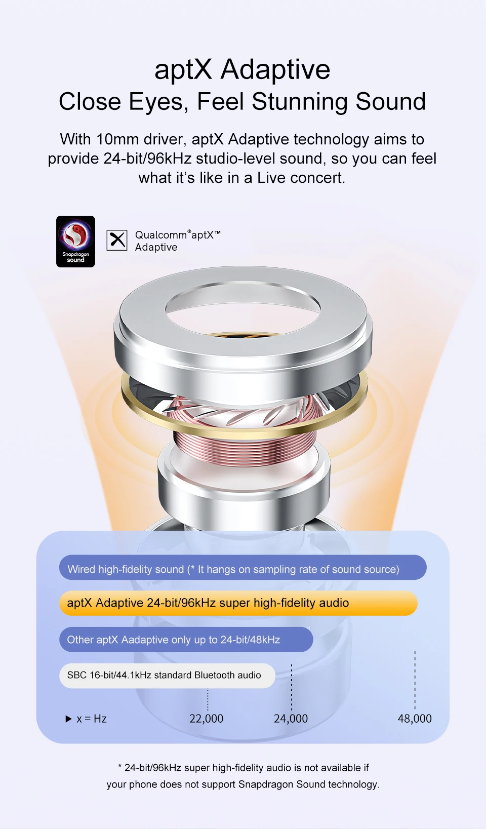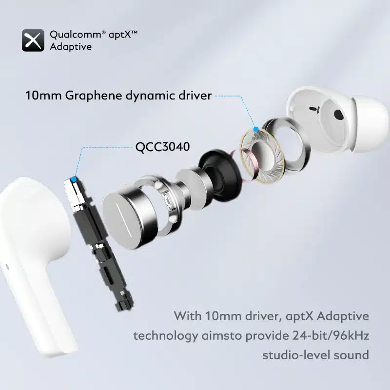 With 10mm Graphene dynamic driver, aptX Adaptive technology aims to provide 24-bit/96kHz studio-level sound, so you can feel what it’s like in a Live concert.